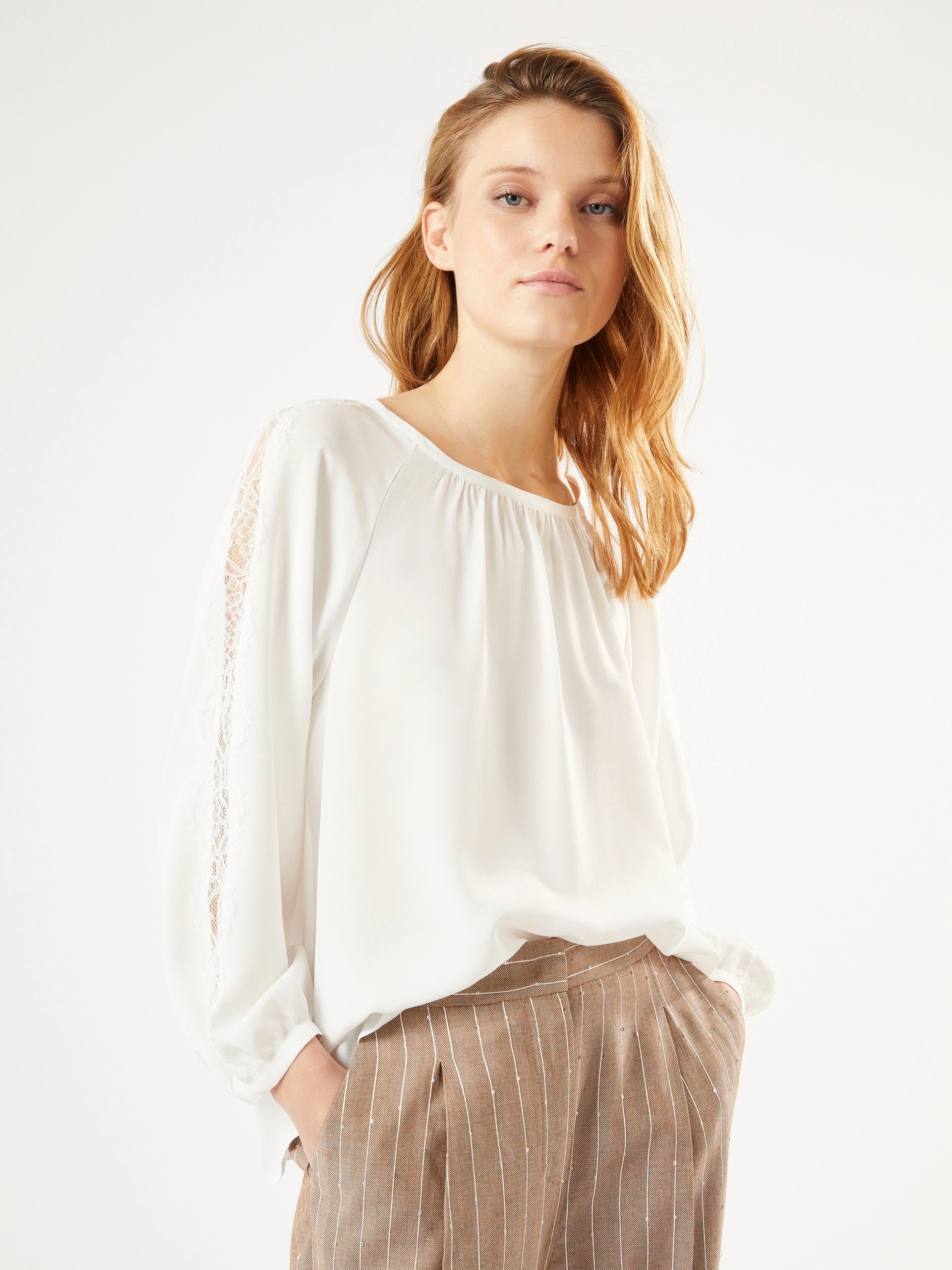 Blusa in blend di seta crêpe de Chine. Delicata, è impreziosita da dettagli in pizzo Chantilly lavorati a intarsio. Scollo arrotondato con lievi arricciature, ampie maniche raglan a trequarti, ha un taglio diritto e morbido. Tessuto principale contenente materie prime derivanti dalla cellulosa del legno ricavata nel rispetto del patrimonio forestale.